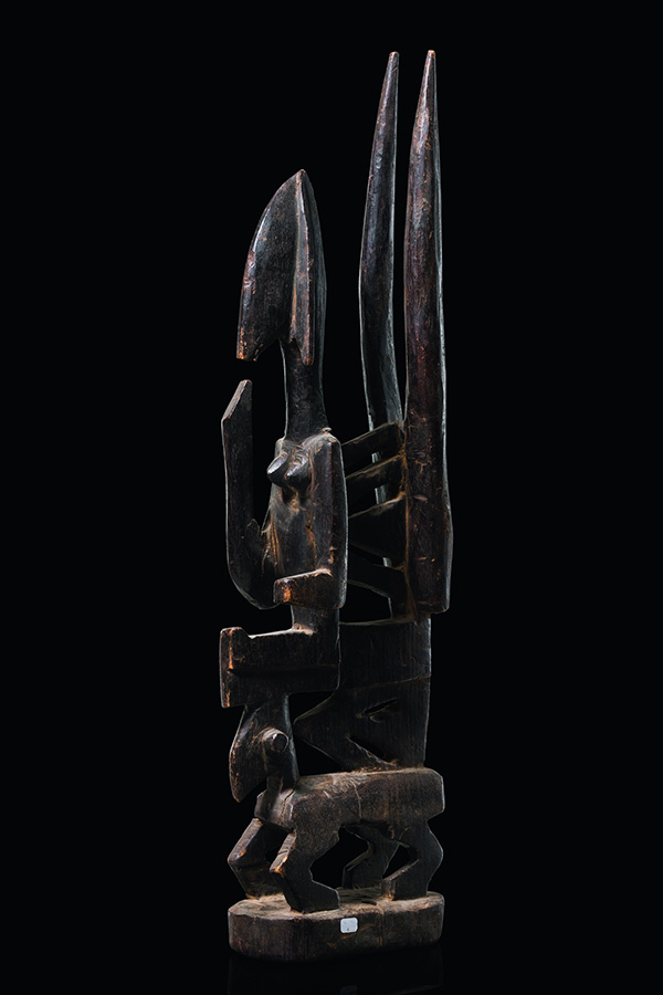 BAMANA ANTELOPE HEADDRESS. The antelope on angled legs, a pierced panel of chevrons on its back, curved horns above, surmounted by a seated female figure with outstretched legs, the long face with tall incised coiffure, pierced plaits to each side with dark wool tassels, dark aged patina.