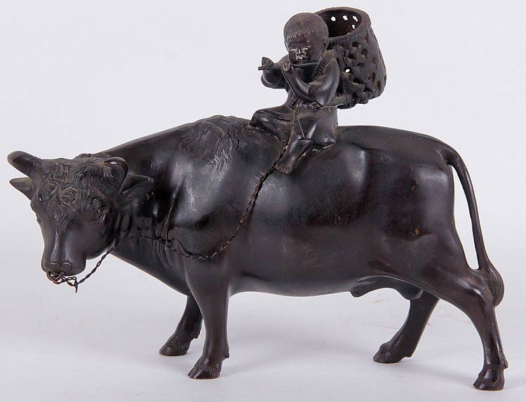 Bronze Figure Boy Riding Ox, the boy depicted playing a flute, with a woven basket strapped to his back, the ox with a rope twist yoke and gilt hooves, artist signed as pictured.
