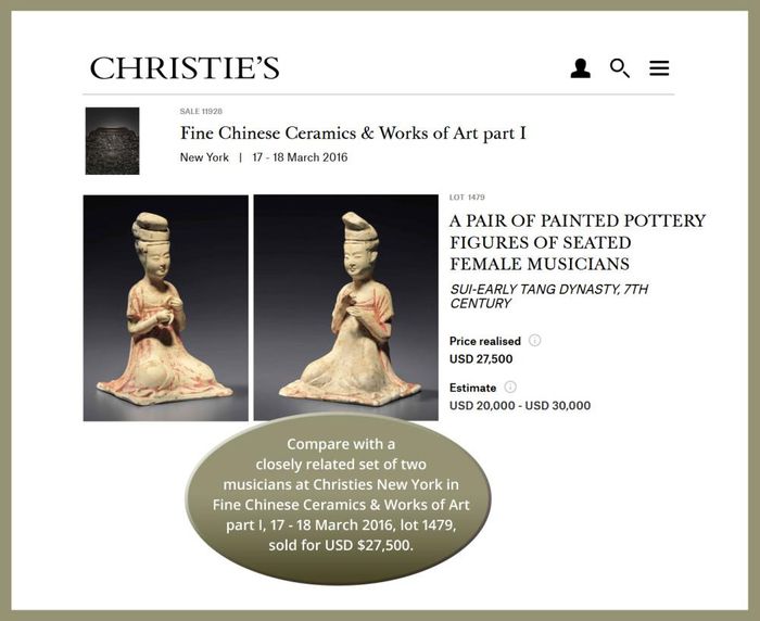 Auction result comparison: Compare with a closely related set of two musicians at Christies New York in Fine Chinese Ceramics & Works of Art part I, 17 – 18 March 2016, lot 1479, sold for USD $27,500. See photo number 56
