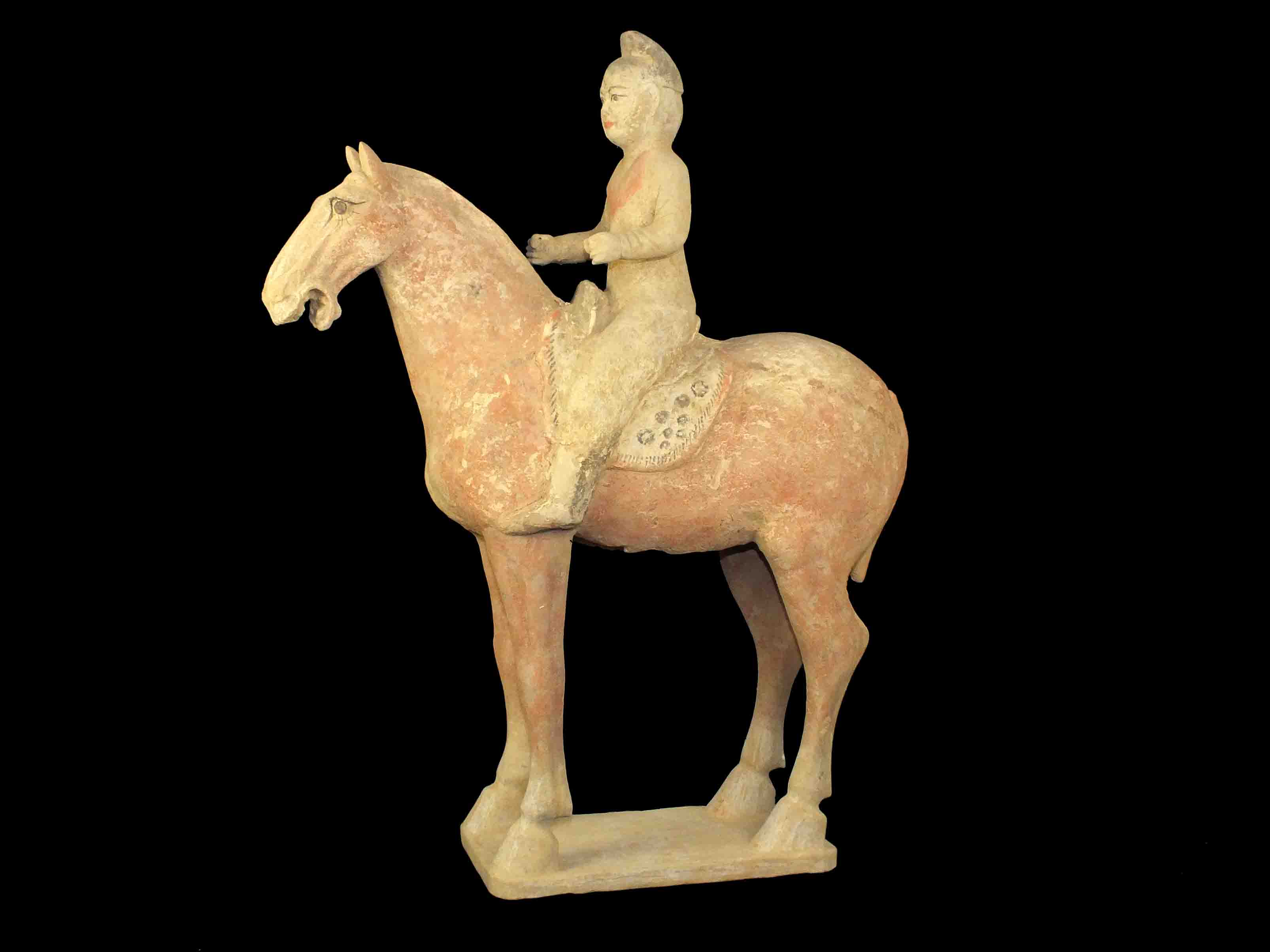 Horse and Rider Tang, a painted red pottery equestrian figure, the foreign rider with his hands positioned as if pulling on the reins, he wears a short jacket belted over a tunic and pants, his hair pulled up and bunched above his forehead under a cloth tied around his head, his face is well modelled with stern expression and a hooked nose, big round eyes, seated astride a saddle with black saddle cloth and white, red and black saddle blankets, the horse standing four-square with open mouth, red body, with traces of red slip, black, red and white pigment.