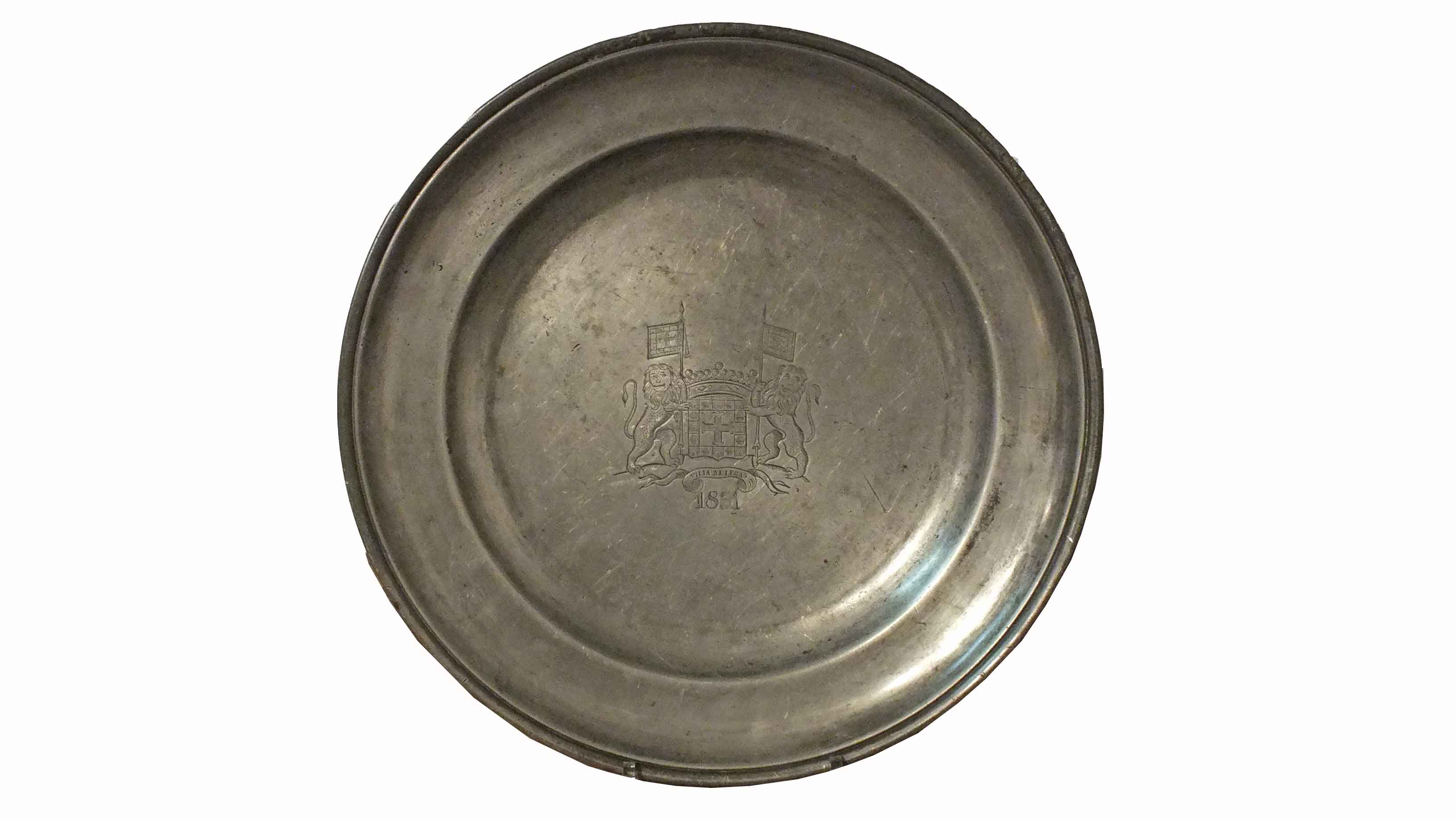 Large Pewter Plate [wpsgallery] S O L D Large Pewter Plate Diameter 38 cm. Dated 1851 Large Pewter Plate, with an unusual soft engraving of two lions holding the plate dated 1851, with the text of “Vicia Nelegas”.
